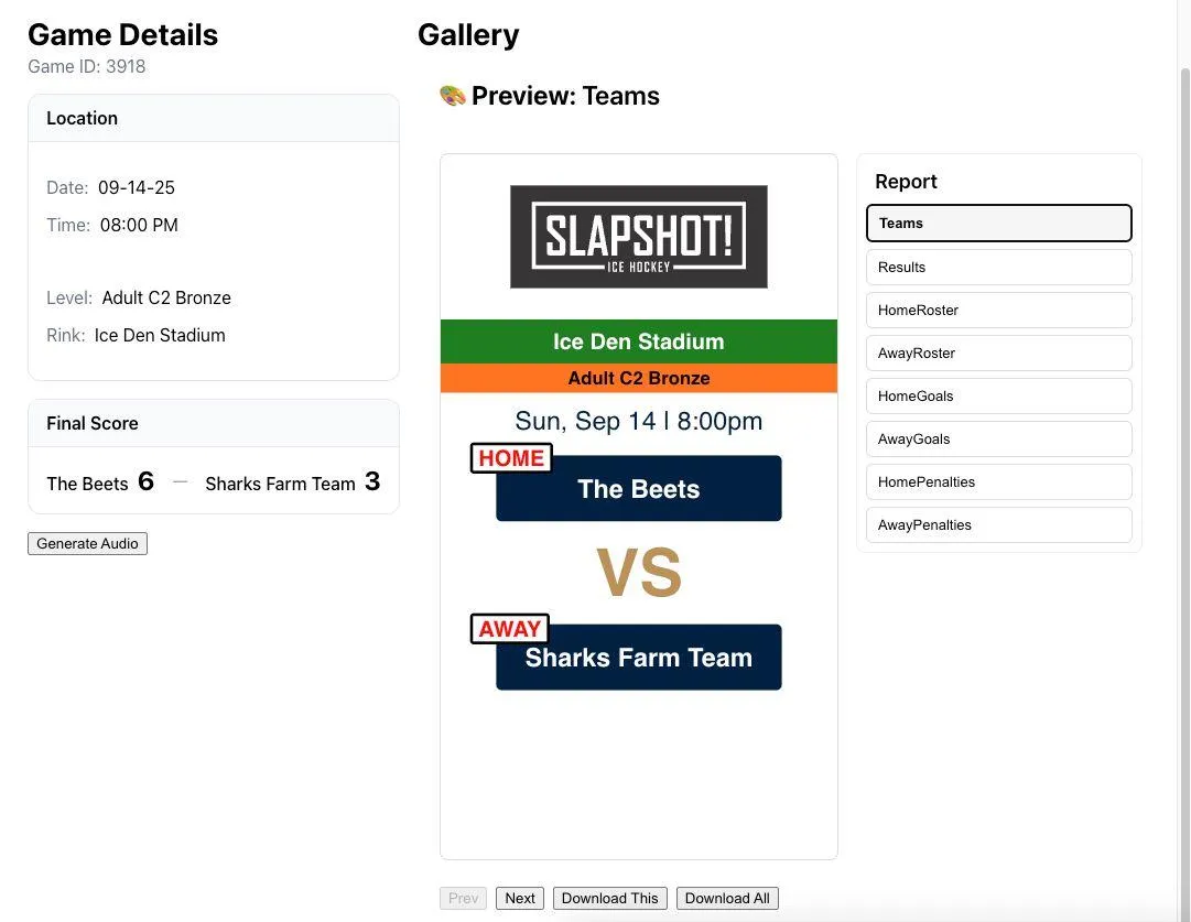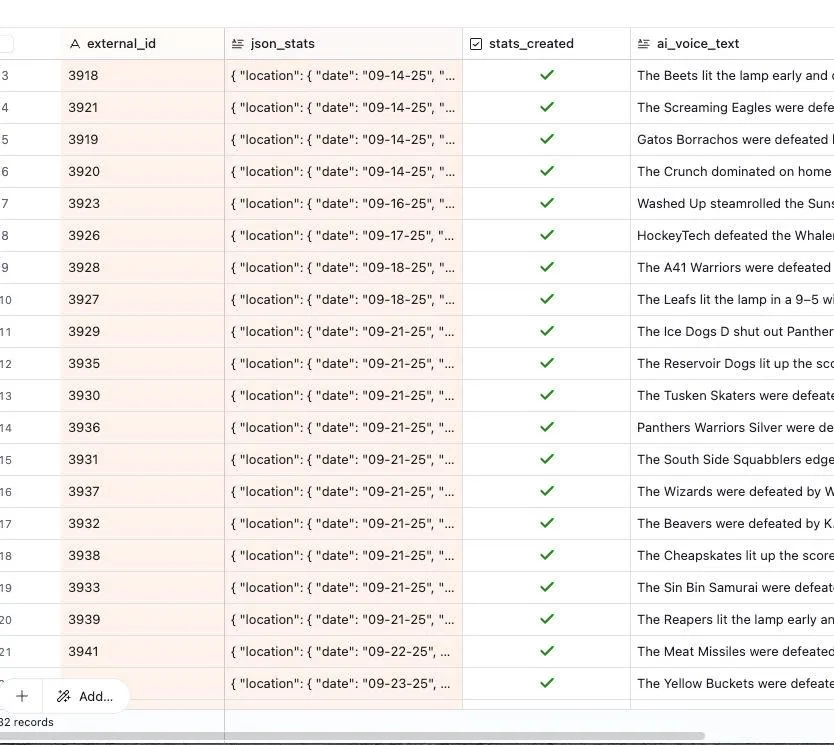 I built a system that takes league stats from the web, parses them with ChatGPT, and pushes them into a custom React dashboard. From there, it generates game reports, audio commentary with ElevenLabs, and formatted videos through CapCut — all automated with Make.com and Airtable. The result? Every game gets a professional recap, ready to post on Instagram.